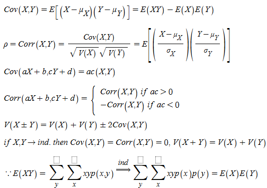 이로부터 공분산과 상관계수가 나온다. 공분산의 scale 문제를 표준화하여 (-1, 1) 범위에서 나타낸 것이 상관계수이다. 두 확률변수의 선형관계만을 표현하는 것임에 주의하자.